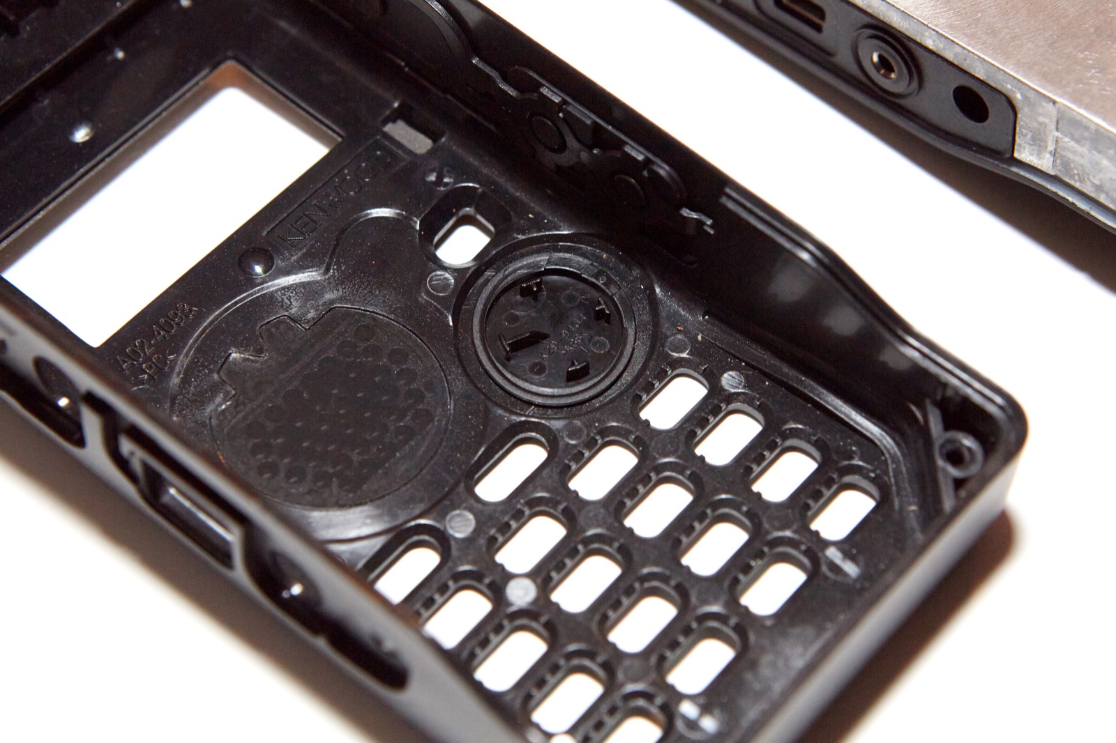 With the rubber cover off, you can now pull the case off of the radio. Pull it up and out of the case from the bottom end of the radio. You’ll probably feel some pieces come loose. These are the 4-way arrow rocker-button cover and possibly the rubber keypad. Catch them and put them aside if they fall out. You know, instead of mailing them to Grandma. With the main cover tipped up (or down depending on how you’re holding the radio), you’ll need to pull the case up to slide it off of the top over the knob shaft. Looking at my picture, you’d slide the radio to the right and “out” of the case.