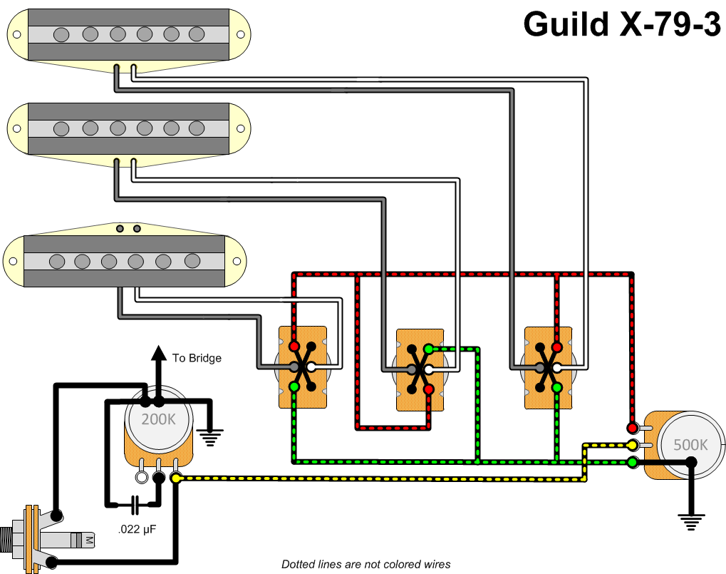 The Guild catalog from 1983 says that the X79-3 features three specially made Guild single coil pickups. The pickups in my Guild X79-3 appear to be Dimarzio SDS-1s which are pretty odd looking units from the back. They have cream-colored baseplates and contrary to normal Statocaster pickups that use the pole pieces as the magnets, the SDS-1s utilize ceramic bar magnets which is more like the way that a P90 pickup is built. The SDS-1 webpage sells them as sounding similar to soapbar pickups while also exibiting much less magnetic pull than normal Strat-type single coils. They go on to say that, The highs are less exaggerated and the bottom is deeper than most singles for a rounder, darker tone. I should point out that not all X79-3s appear to have come with these pickups, so you may have different results if you find one for sale.