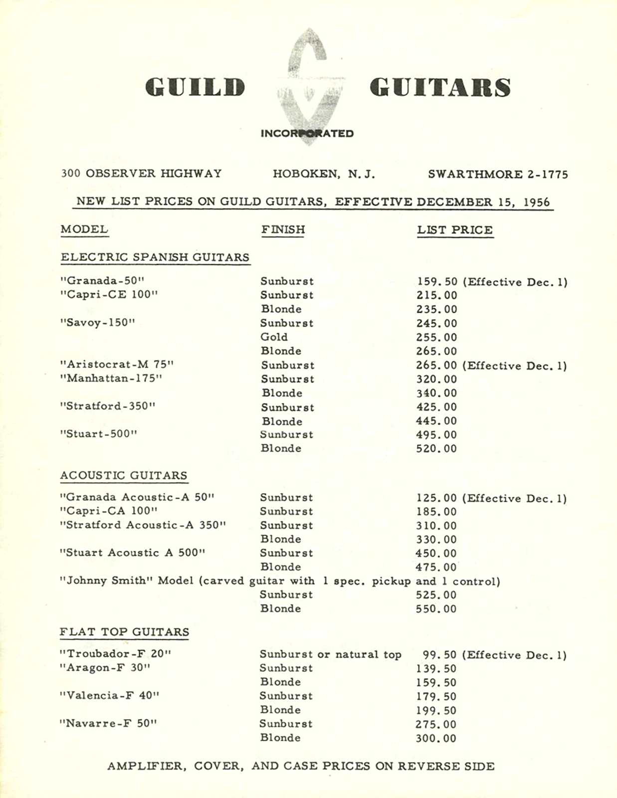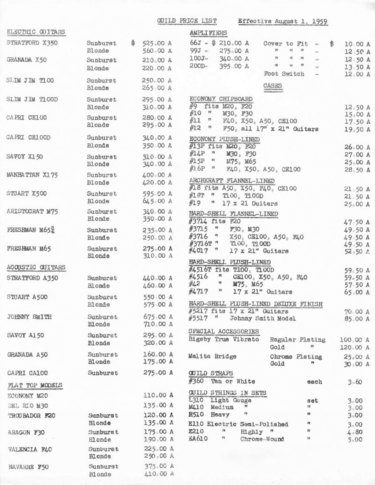 Welcome to GAD’s Guilds guitar price-list collection. I’ve spent many years (and too many dollars) collecting these documents for my research of various Guild guitars for my GAD’s Guild articles. I became frustrated by people charging for the privilege of looking at catalogs and I firmly believe that this stuff should be available for everyone’s research use, so here they are. I have physical copies of every price-list shown, and where I don’t have the document in my possession, the document was lended to me by Kurt over at The Guilds of Grot who deserves serious kudos for lending my his copies for this effort. These price-lists were all painstakingly scanned or photographed and then straightened, cropped, formatted, digitally repaired where possible, and color-corrected in order to be included here.